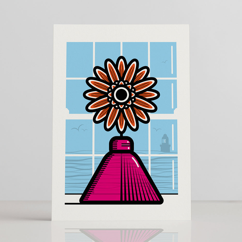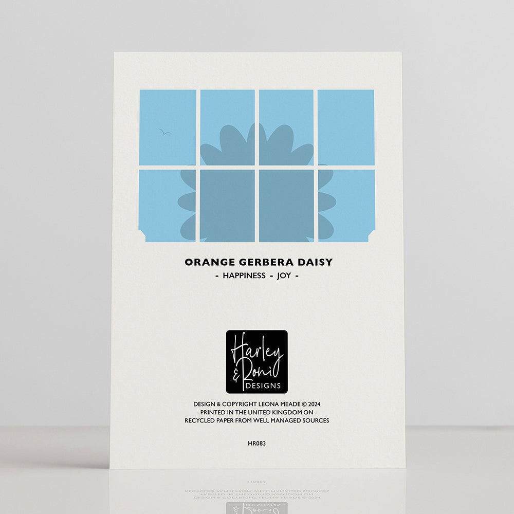 Illustrated orange Gerbera Daisy in pink vase greetings card. Perfect for any occasion, especially birthdays, or to let someone know you're thinking of them.